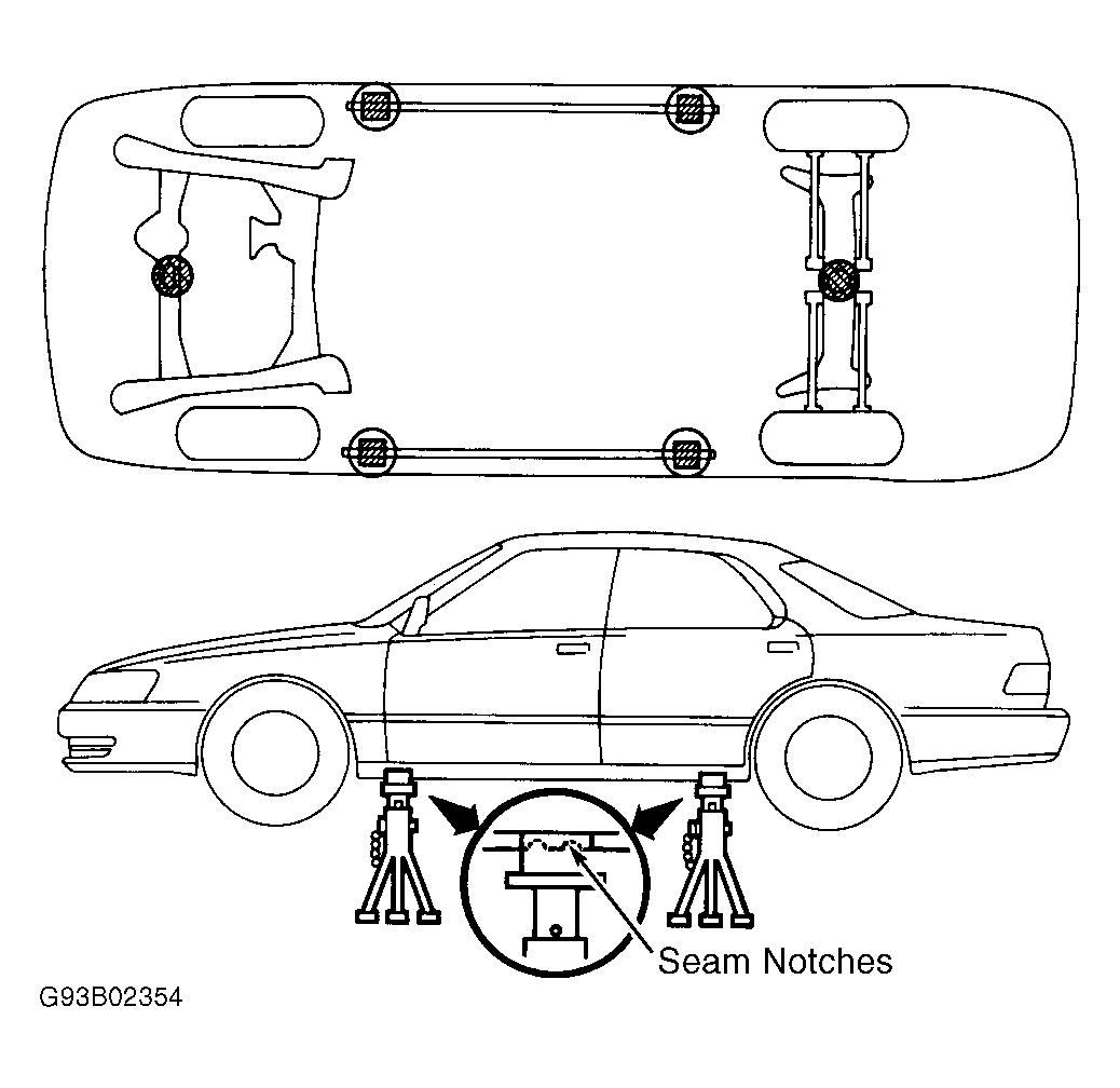 Place manufacturer-supplied jack under reinforced support points of sill, between front and rear wheels. Safety stands may also be placed at these points. See Figure-Figure .