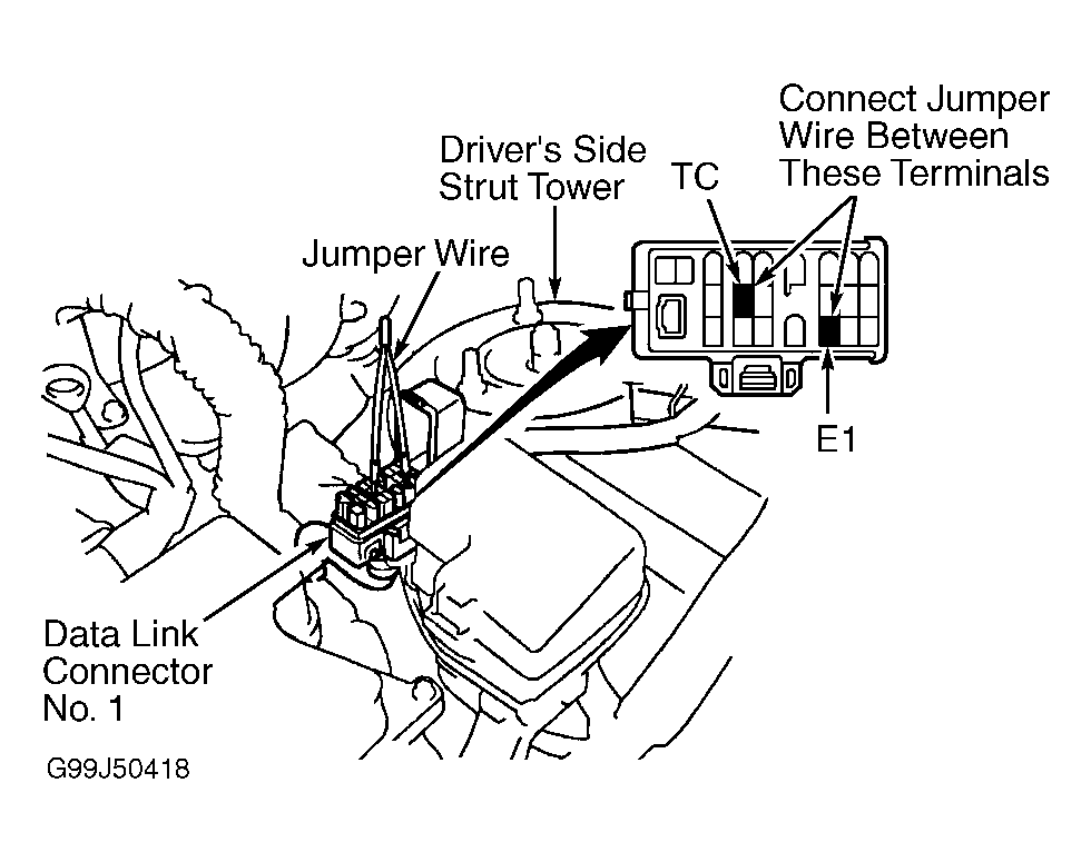 - Install Jumper Wire (SST 09843-18020) between terminals TC and E1 on DLC1 located near driver's side strut tower. See Figure. Apply parking brake. Place transmission in Neutral. Start engine and allow engine to idle.