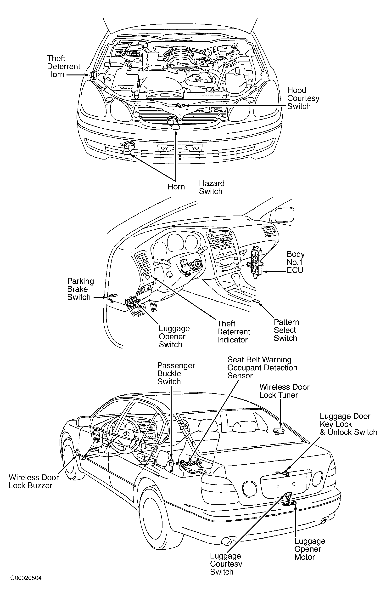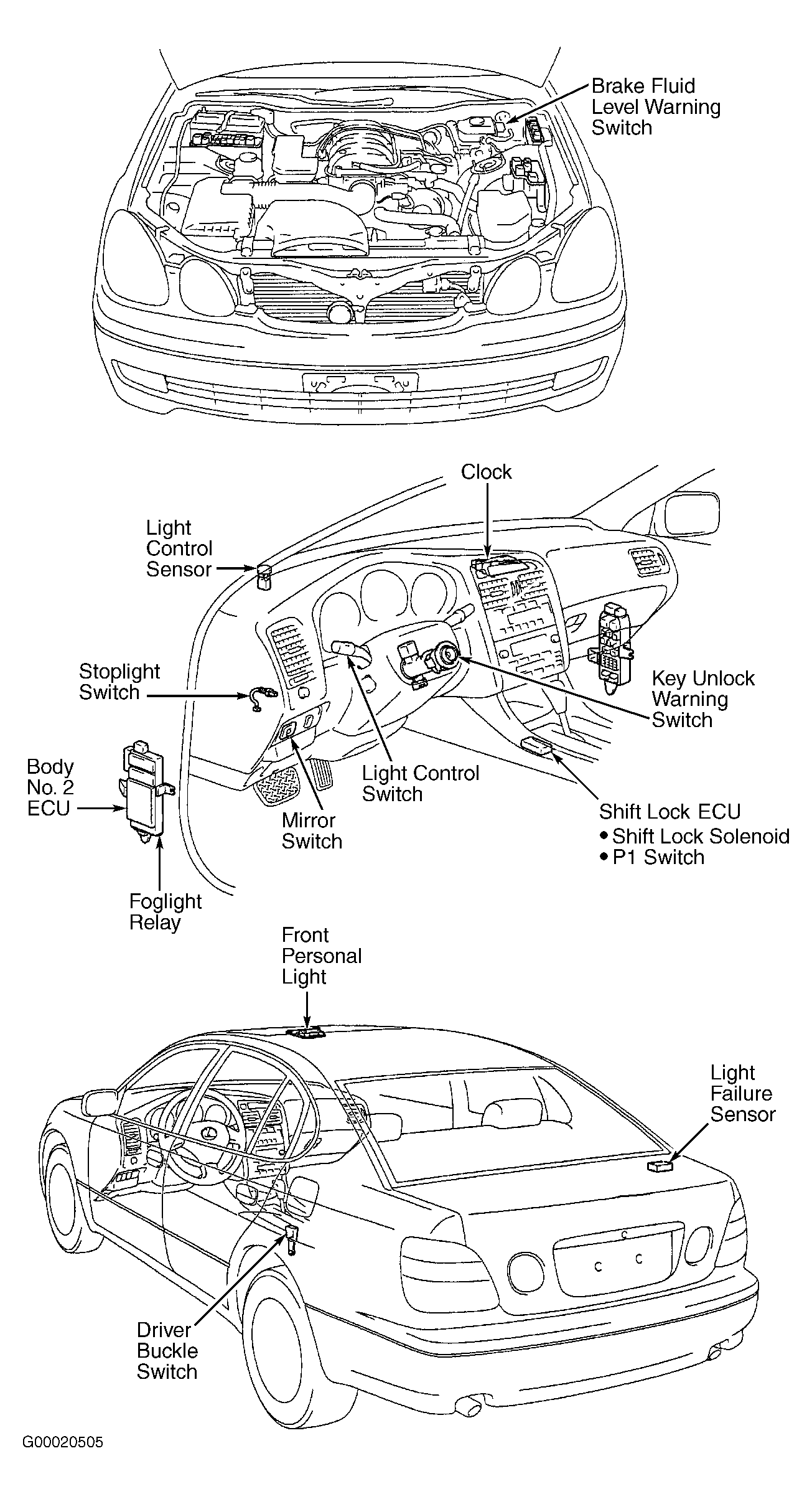 Body control system consists of 2 separate Electronic Control Units (ECUs). Body control ECU No. 1 controls power door locks, remote keyless entry (wireless controls), anti-theft, passenger's seat belt warning indicator and rear window defogger. Body control ECU No. 2 controls automatic light control, illuminated entry, driver seat belt warning indicator and clock. See Fig 1 and Fig 2 .