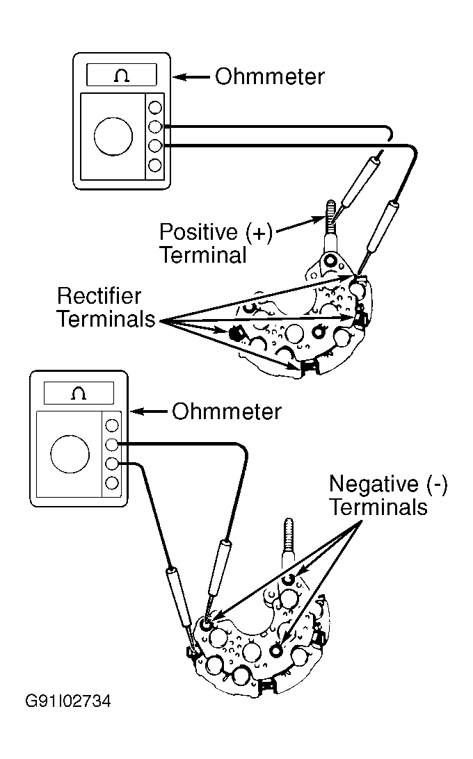 - Connect ohmmeter positive lead to each rectifier terminal and negative lead to each negative (-) terminal. Reverse ohmmeter leads and check again. Continuity should exist in only one direction. If continuity is not as specified, replace diode assembly.