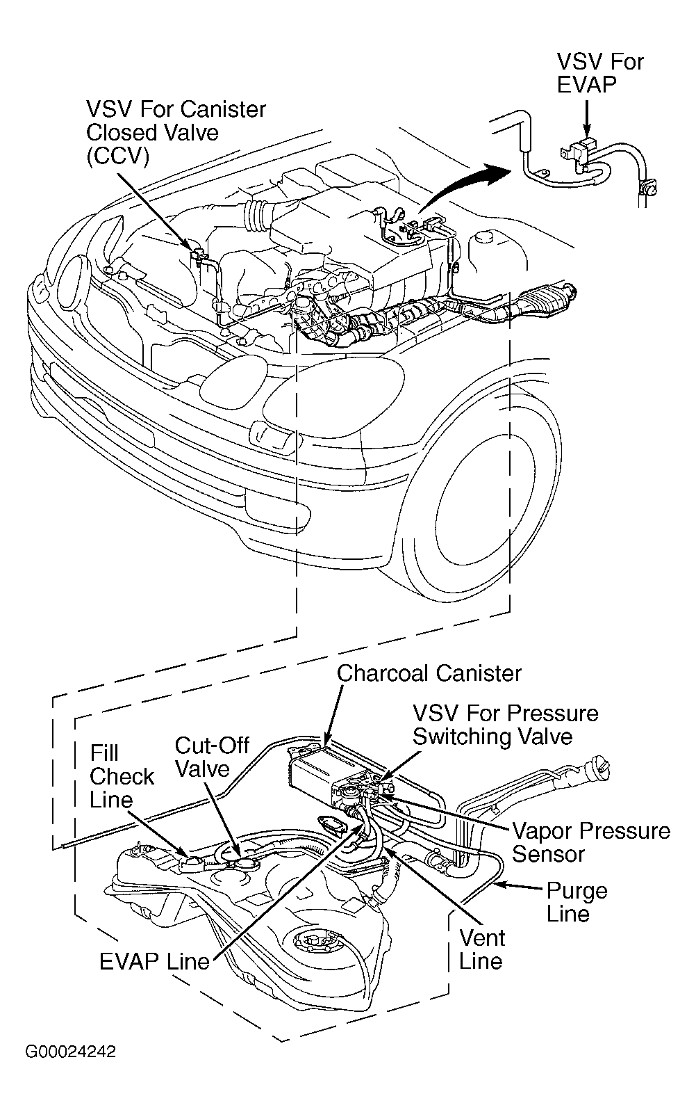 - Locate EVAP VSV on top of engine. See Fig 3-Fig 5 . Disconnect EVAP VSV 2-pin electrical connector. Using jumper wires, connect battery voltage and ground to EVAP VSV terminals. Start engine. Go to next step.