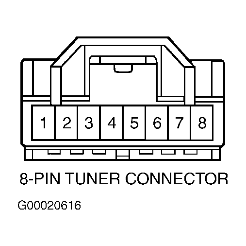 Ensure ignition is off. Disconnect 8-pin tuner connector. See Fig 1. Measure continuity between connector terminal No. 5 and ground. Continuity should be present. Measure voltage between connector terminal No. 8 and ground. Voltage should toggle between 0-5 volts. If continuity and voltages are not to specification, check wiring for an open or short circuit. See WIRING DIAGRAMS .