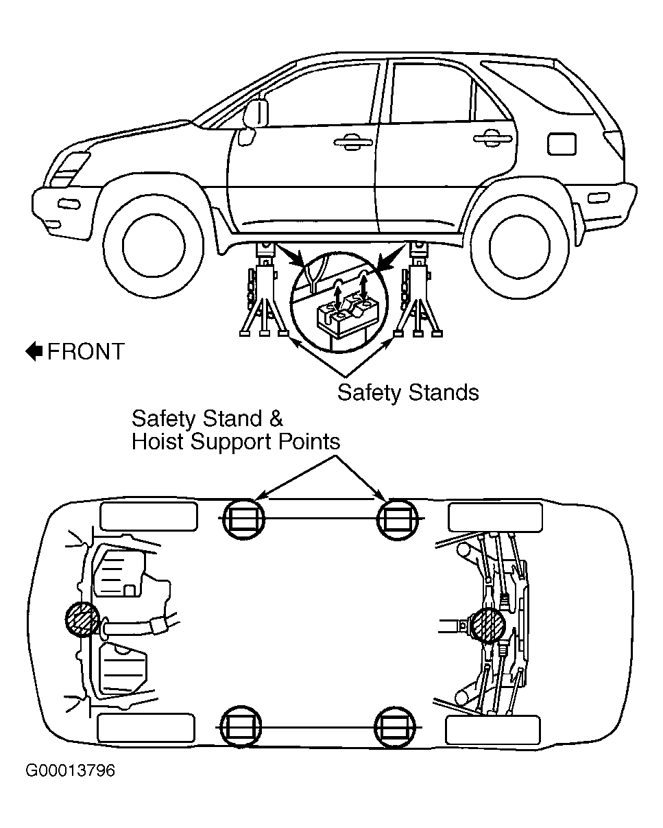 Place manufacturer-supplied jack under reinforced support points of sill, between front and rear wheels. Safety stands may also be placed at these points. See Figure, Figure or Figure .