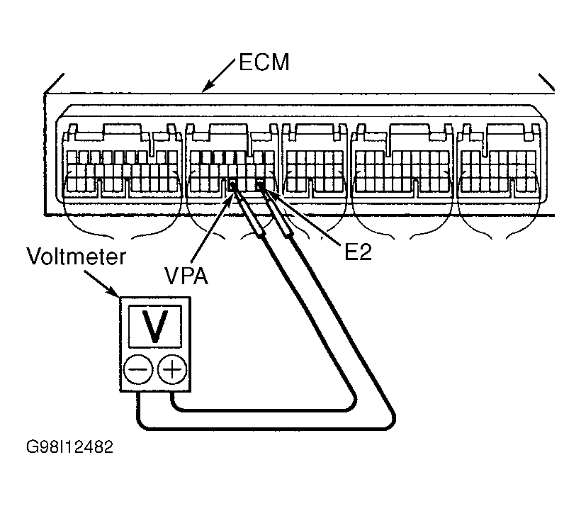 - Access ECM behind glove box. Ensure ignition is turned on. Using voltmeter, check voltage between ECM terminals VPA (Red wire) and E2 (Brown/White wire) with accelerator pedal released and with accelerator pedal fully depressed. See Fig 2.