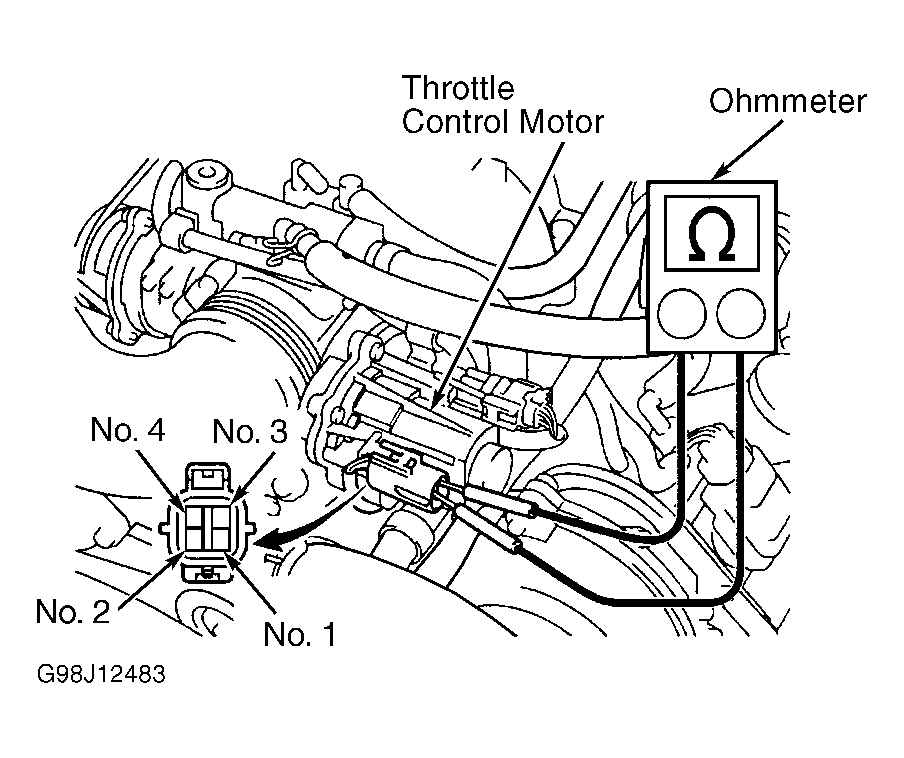 - Using ohmmeter, check resistance between specified terminals on throttle control motor. See THROTTLE CONTROL MOTOR RESISTANCE table. If resistance is within specification, reinstall electrical connector. Go to next step. If resistance is not within specification, replace throttle control motor. See THROTTLE BODY under FUEL SYSTEM in REMOVAL, OVERHAUL & INSTALLATION article.THROTTLE CONTROL MOTOR RESISTANCE