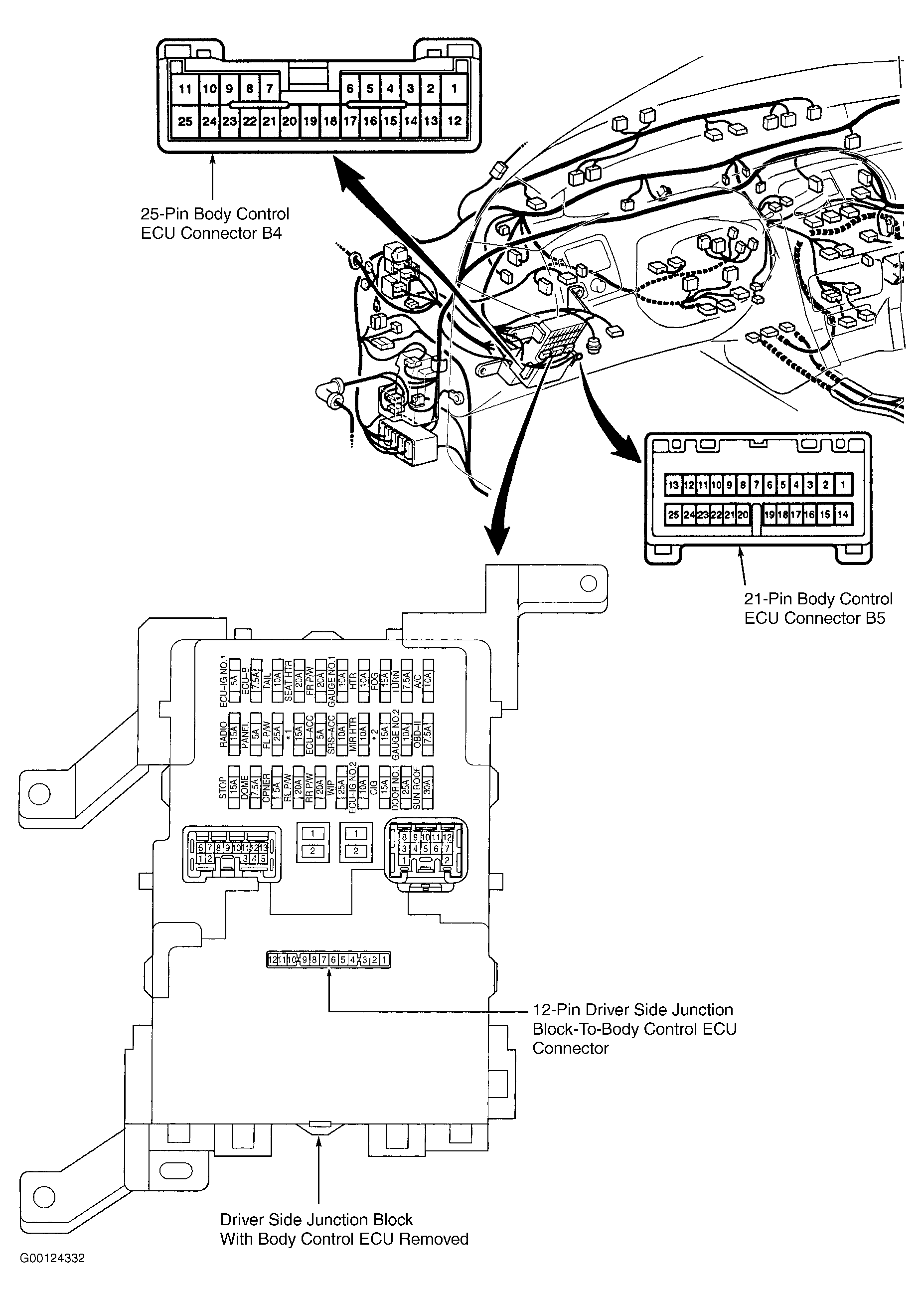 5. Check Red/Black wire between body control ECU 25-pin connector B4 terminal No. 10 and terminal No. 3 of DRL relay No. 2. See Figure. Check wire harness and connectors between battery and DRL relay No. 2. Also check wire harness and connectors between DRL relay No. 2, DRL relay No. 3 and DRL relay No. 4. See HEADLIGHTS in SYSTEM WIRING DIAGRAMS article. If wire harness and connectors are okay, go to next step. Repair or replace wiring or connectors as necessary. After repairs, perform confirmation test. See CONFIRMATION TEST .