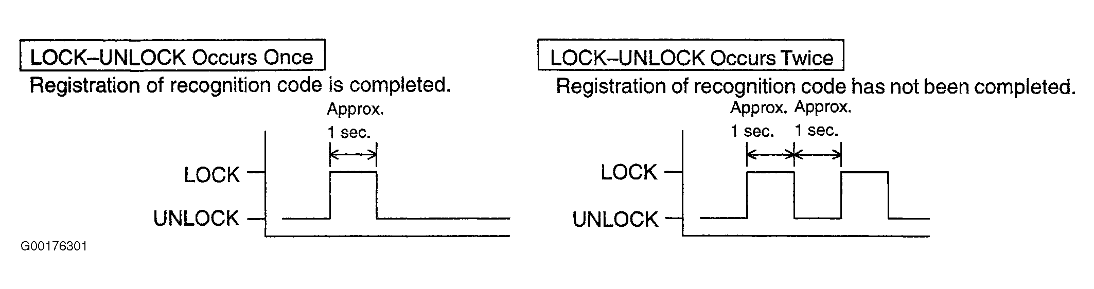 - Within 3 seconds after the transmitter switch has been turned OFF, the LOCK-UNLOCK operation will be automatically performed once if the registration of the recognition code of the transmitter is completely correctly. See Fig 3. In case the LOCK-UNLOCK operation is performed twice, the registration of recognition code has failed. Perform the registration procedure from the beginning once again.