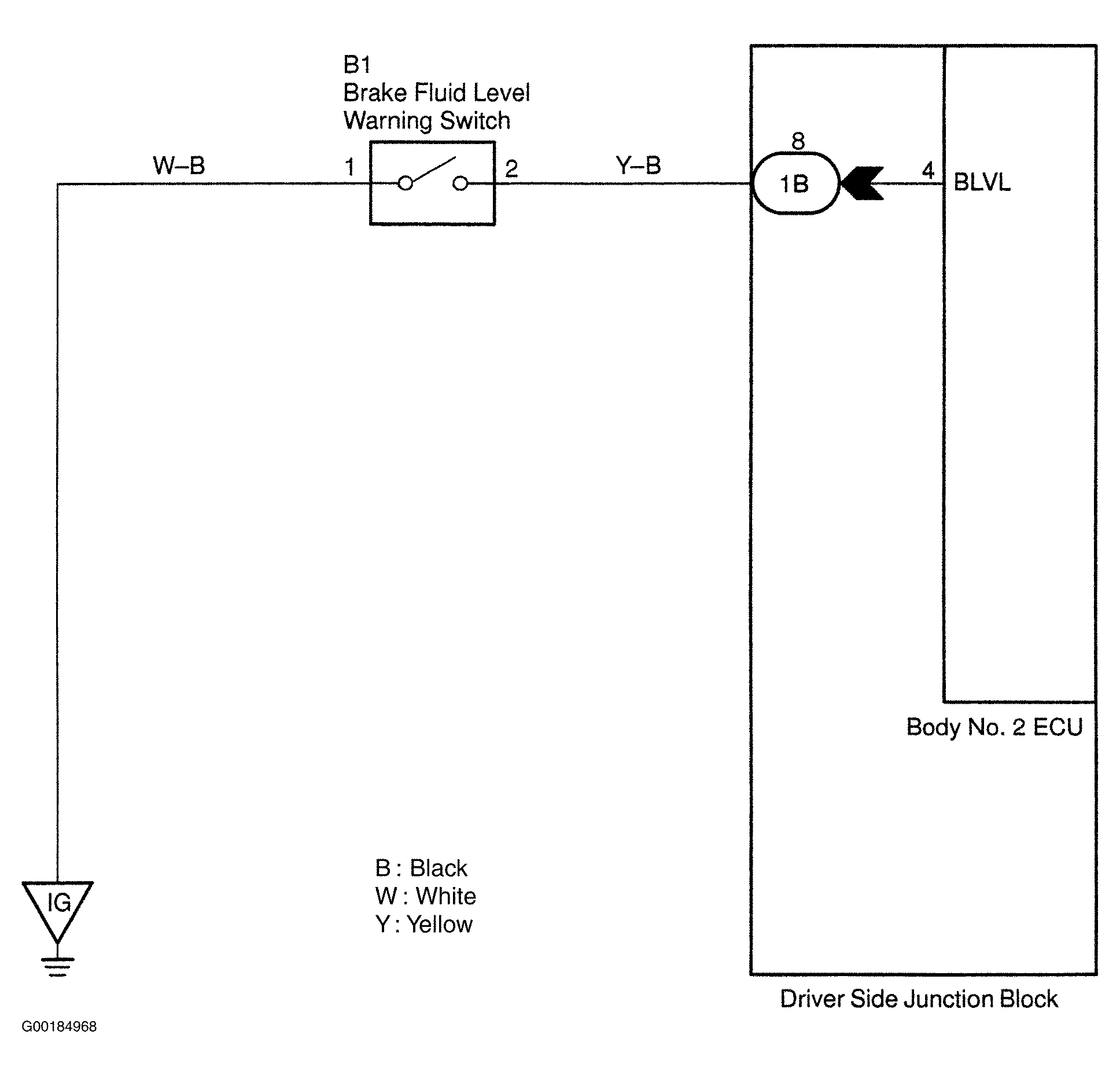 - Check for short to power, short to ground and continuity in the wiring harness and connector between the brake fluid level warning switch and body ECU No. 2. If the results are OK, inspect the instrument cluster and replace as necessary. See INSTRUMENT PANEL article. If the results are not OK, repair or replace the wiring harness or connector.