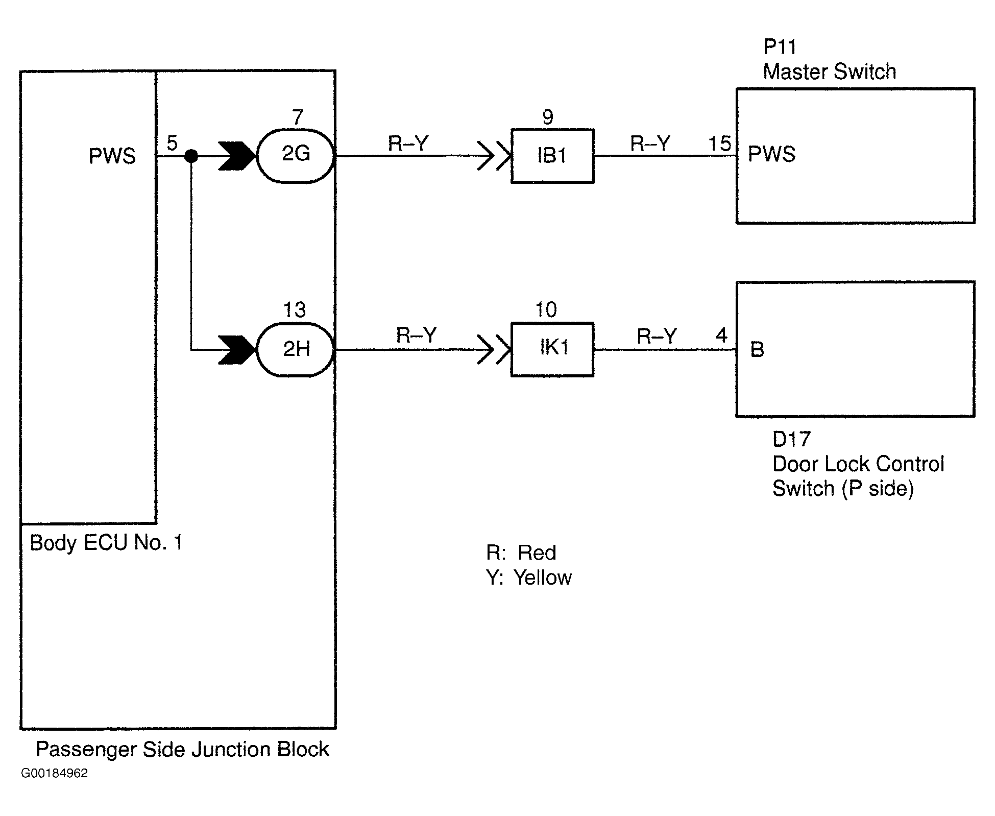 Check for short to power, short to ground and continuity in the wiring harness and connectors between the master switch and body ECU No. 1, and door lock switch of passenger door and body ECU No. 1. If the results are OK, inspect the power window master switch circuit. See POWER WINDOW MASTER SWITCH CIRCUIT (DRIVER) under CIRCUIT TESTS under POWER WINDOWS in WINDOWS. If the results are not OK, repair or replace the wiring harness or connector.