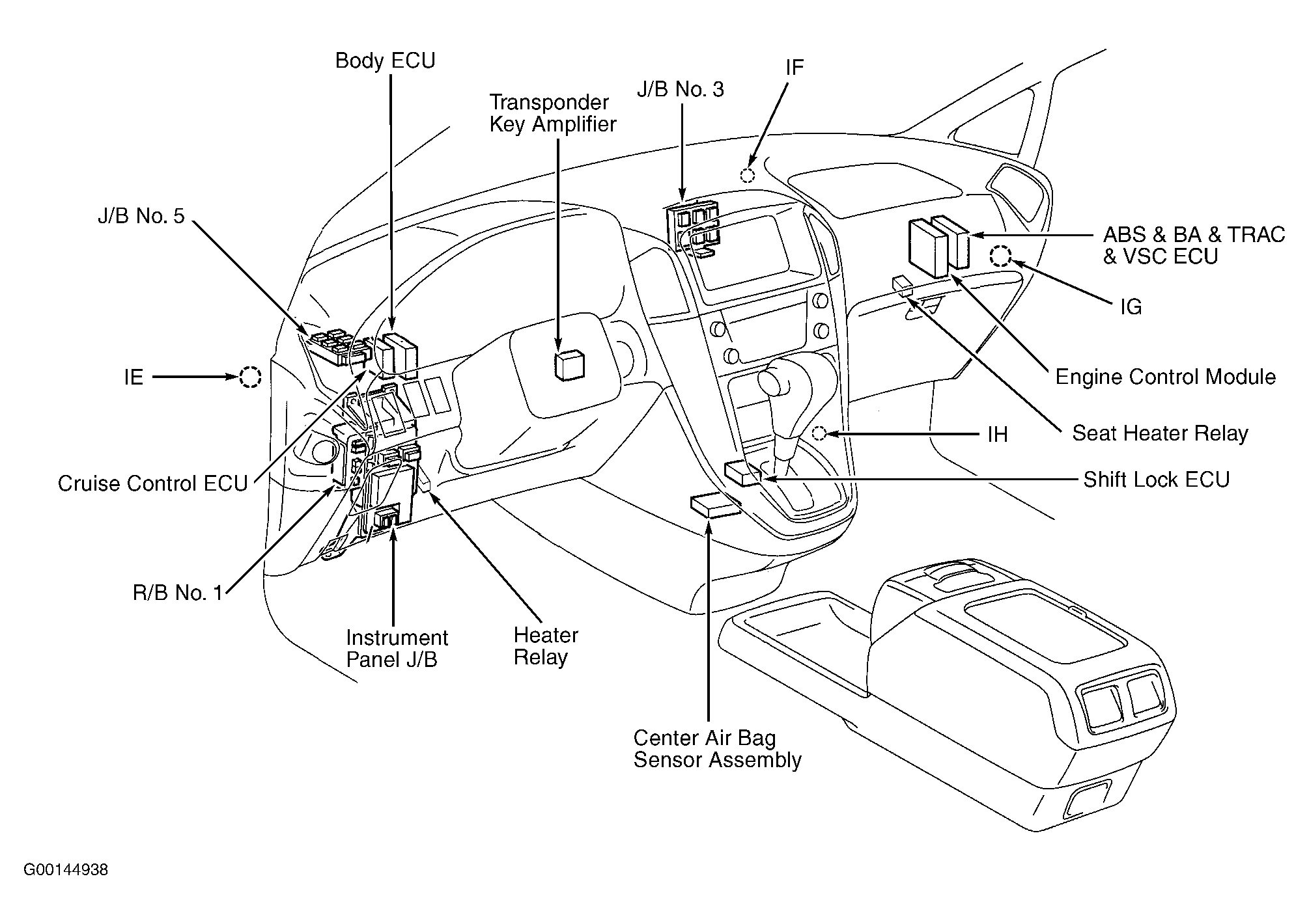 | ABS, BA, TRAC & VSC ECU | Behind right side of dash. See Figure. |