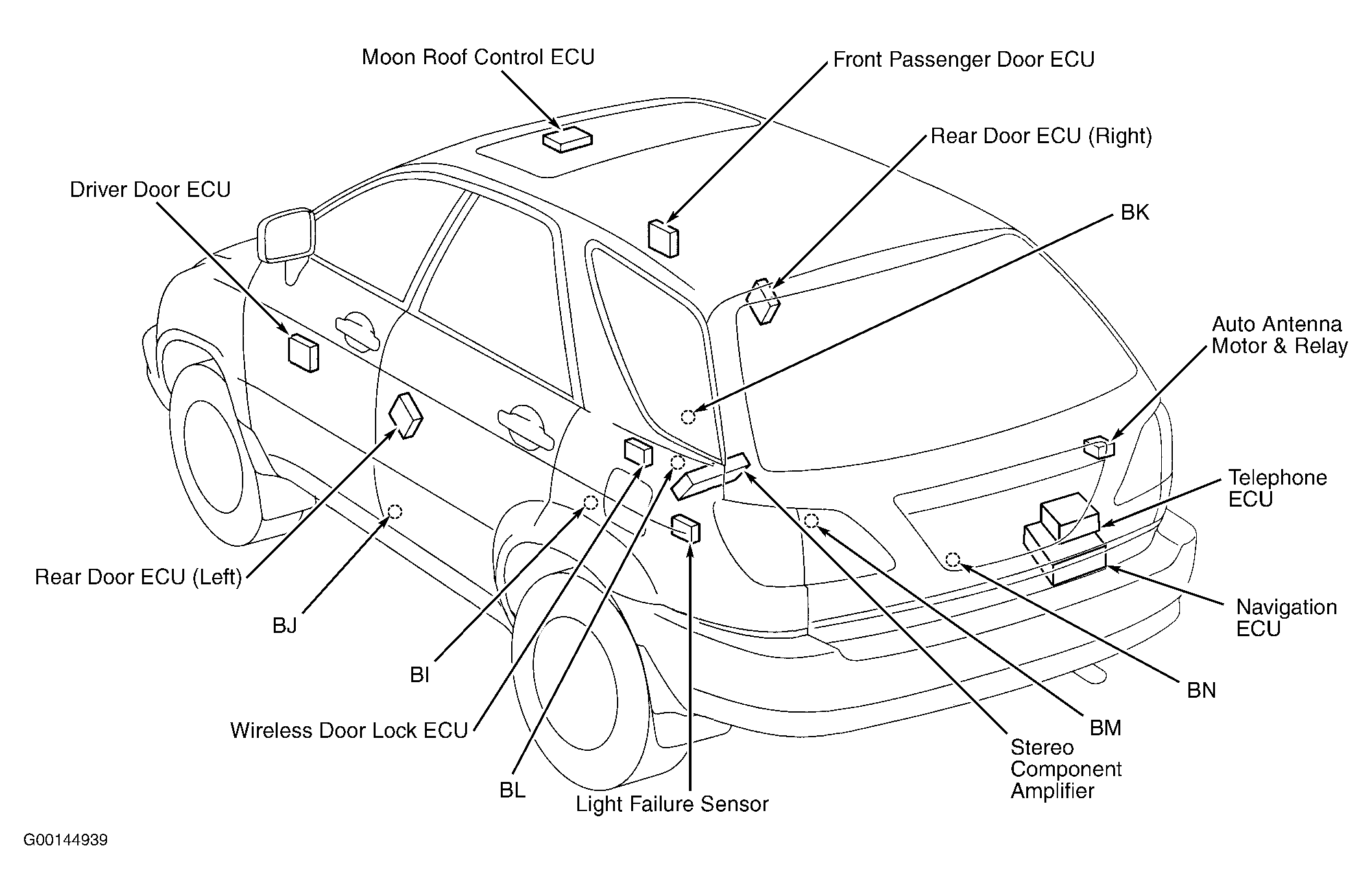 | Wireless Door Lock ECU | In center of vehicle. See Figure. |