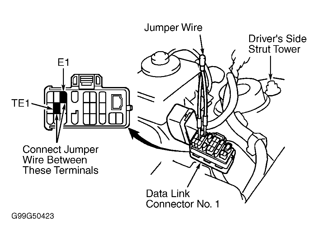- Install Jumper Wire (SST 09843-18020) between terminals TE1 and E1 on DLC1. See Fig 2. DLC1 is located on end of air intake chamber at passenger's side of engine compartment.