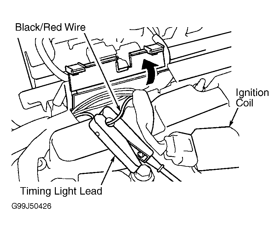 - Connect timing light lead to Black/Red wire at ignition coil electrical connector on top of front valve cover at cylinder No. 4. See Fig 1. Open wiring harness cover to gain access if necessary. Cylinder No. 4 is second cylinder on left side when viewed from flywheel end of engine. See Figure.