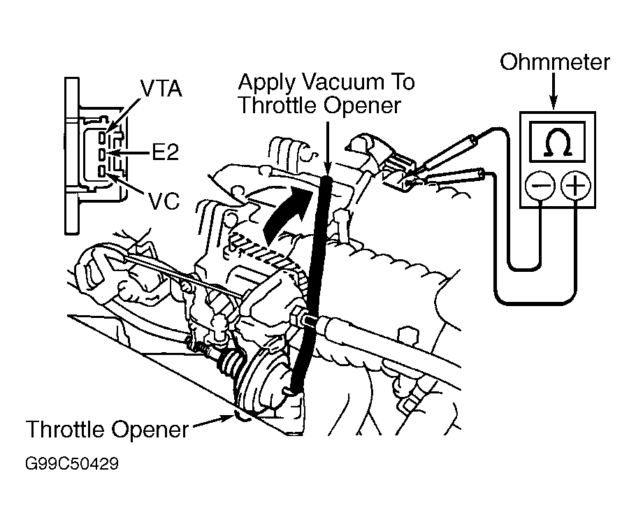 - Disconnect electrical connector from TP sensor. Note electrical terminals on TP sensor. See Fig 1. Apply vacuum to throttle opener.