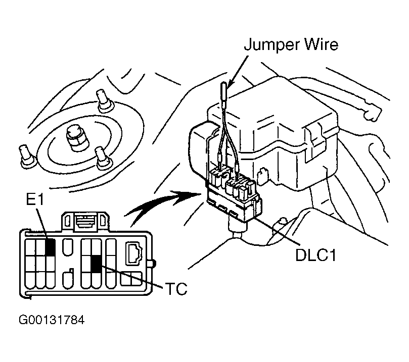 - Install Jumper Wire (SST 09843-18020) between terminals TC and E1 on DLC1 located near driver's side strut tower. See Fig 3. Apply parking brake. Place transmission in Neutral. Start engine and allow engine to idle.