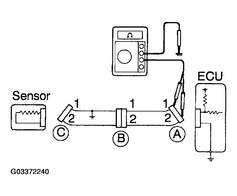 As shown in Fig 9, with each connector still connected, measure the voltage between the body ground and terminal 1 of connector "A" at the ECU 5V output terminal, terminal 1 of connector "B", and terminal 1 of connector "C", in that order.