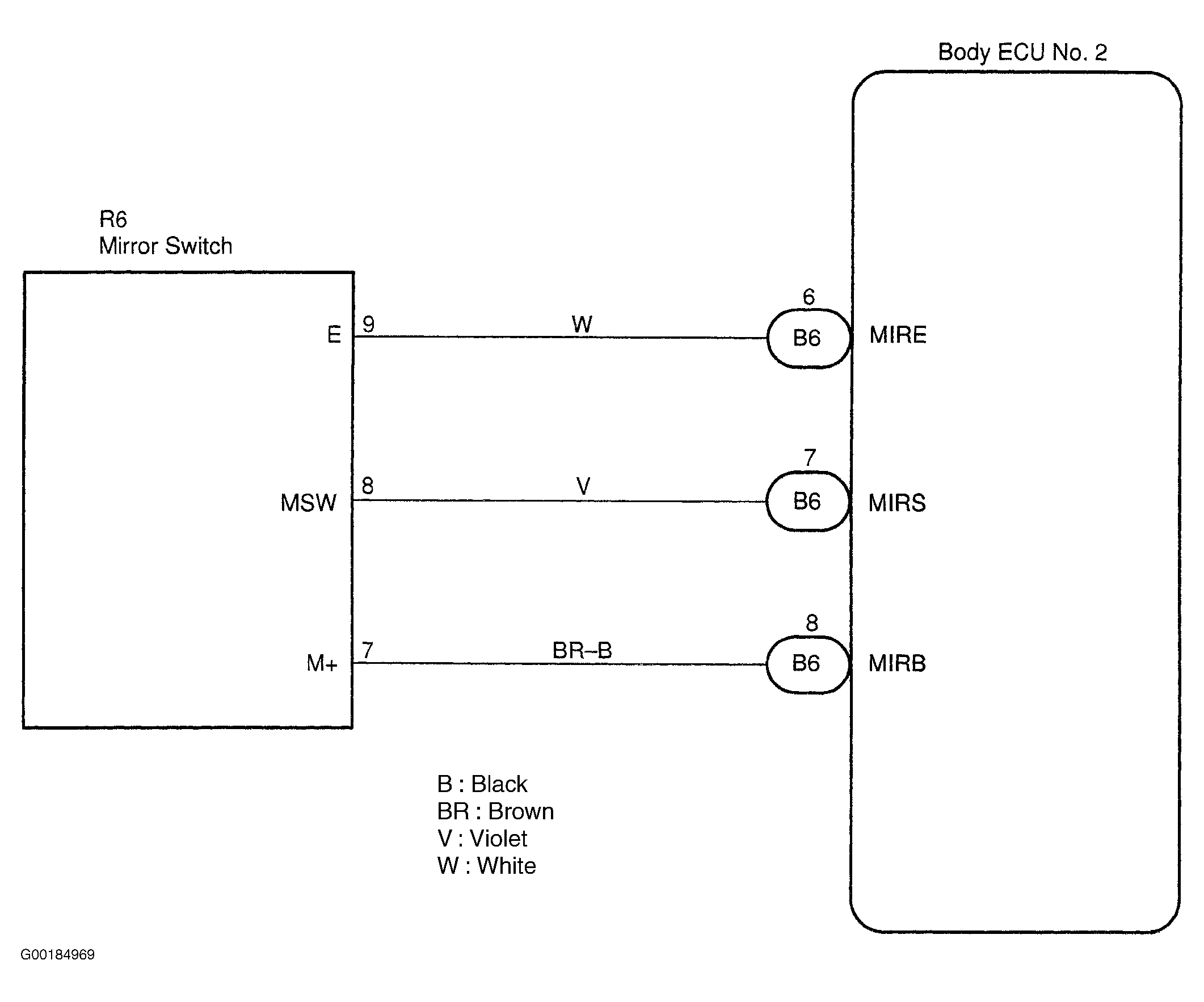 - Check for short to power, short to ground and continuity in the wiring harness and connector between the mirror switch and body ECU No. 2. If the results are OK, inspect the body ECU No. 2. If the results are not OK, repair or replace the wiring harness or connector.