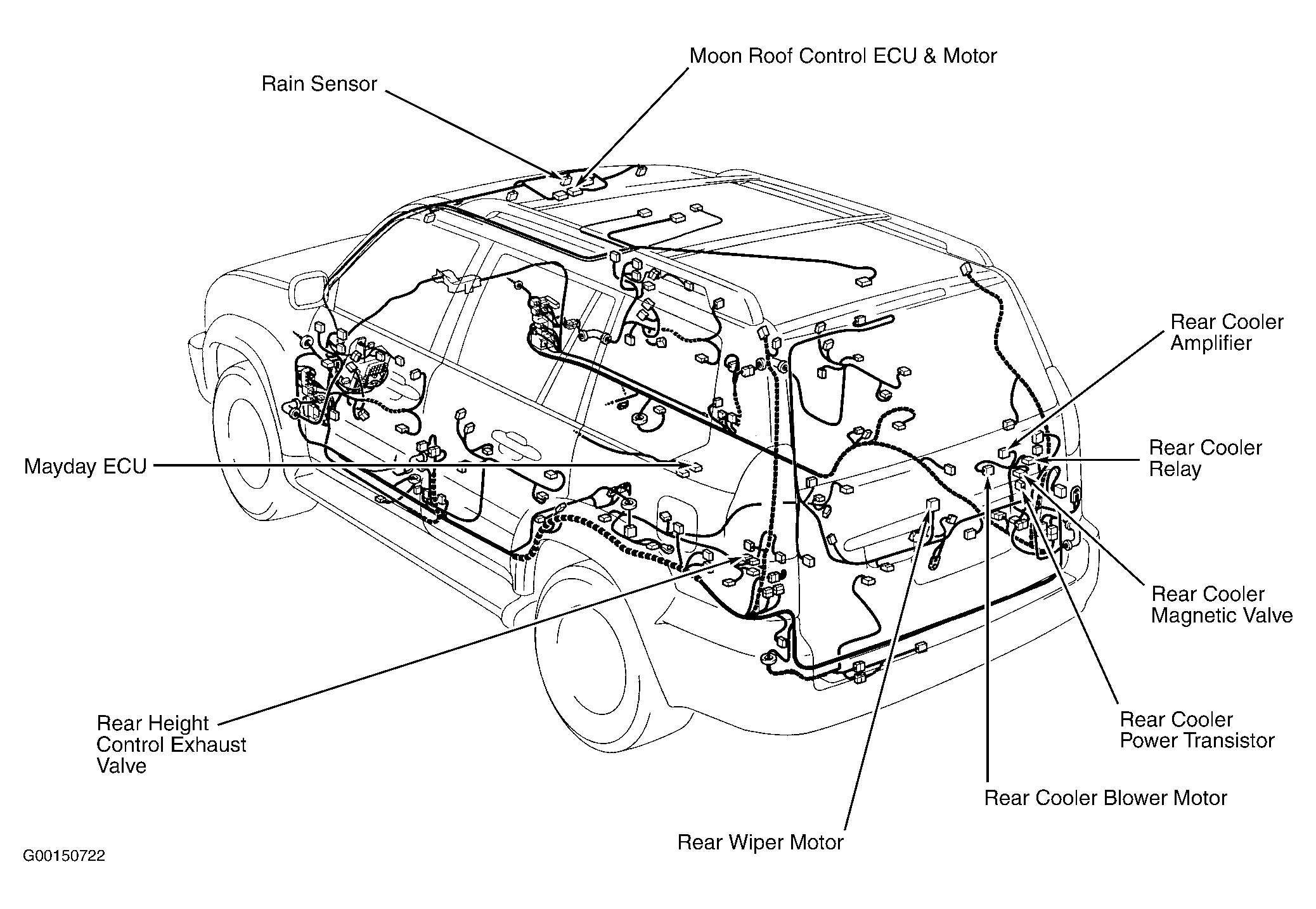 Moon Roof Control ECU & Motor Above headliner, at center of windshield header. See Figure.