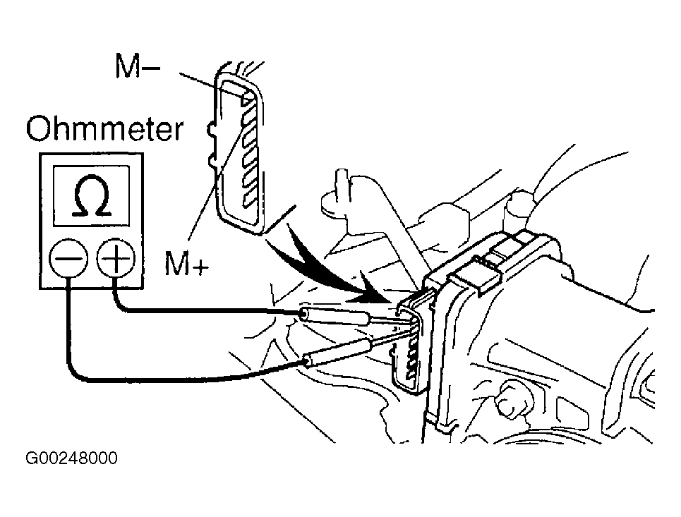 - Using ohmmeter, check resistance between terminals M+ and M- on throttle control motor. See Fig 2. Motor resistance should be .3-100 ohms at 68°F (20°C). If resistance is within specification, reinstall electrical connector. Go to next step. If resistance is not within specification, replace throttle control motor. See THROTTLE CONTROL MOTOR