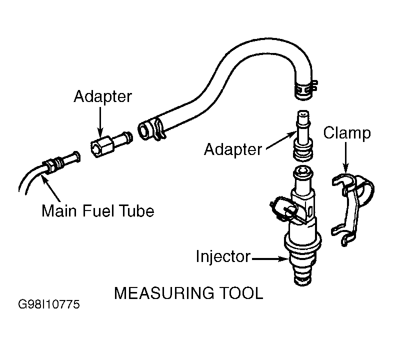 1. Remove fuel injector. See FUEL RAILS & INJECTORS under FUEL SYSTEM in REMOVAL & INSTALLATION - EXCEPT GX470 article. Disconnect fuel inlet hose from main fuel tube. Install Fuel Tube Adapter (09268-52011) to fuel main tube. Connect fuel hose from Injection Measuring Tool Set (09268-41047) to fuel tube adapter. See Fig 1.
