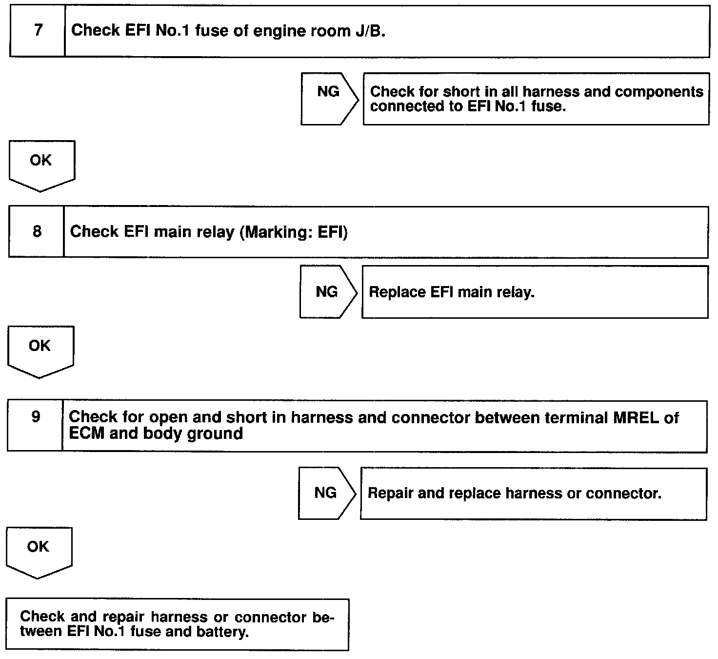 When the ignition switch is turned ON, battery positive voltage is applied to terminal IGSW of the ECM and the EFI main relay (Marking: EFI) control circuit in the ECM sends a signal to terminal MREL of the ECM switching on the EFI main relay.