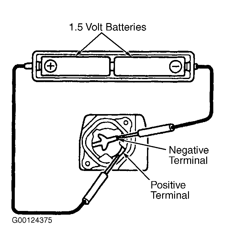 - Remove battery and replace with new battery. See REMOTE TRANSMITTER BATTERY REPLACEMENT under REMOVAL & INSTALLATION. If new battery is not available, connect 2 new 1.5-volt batteries in series. Using jumper wires, connect positive lead to positive (side) terminal of remote transmitter and connect negative lead to negative (bottom) terminal of remote transmitter. See Fig 1.