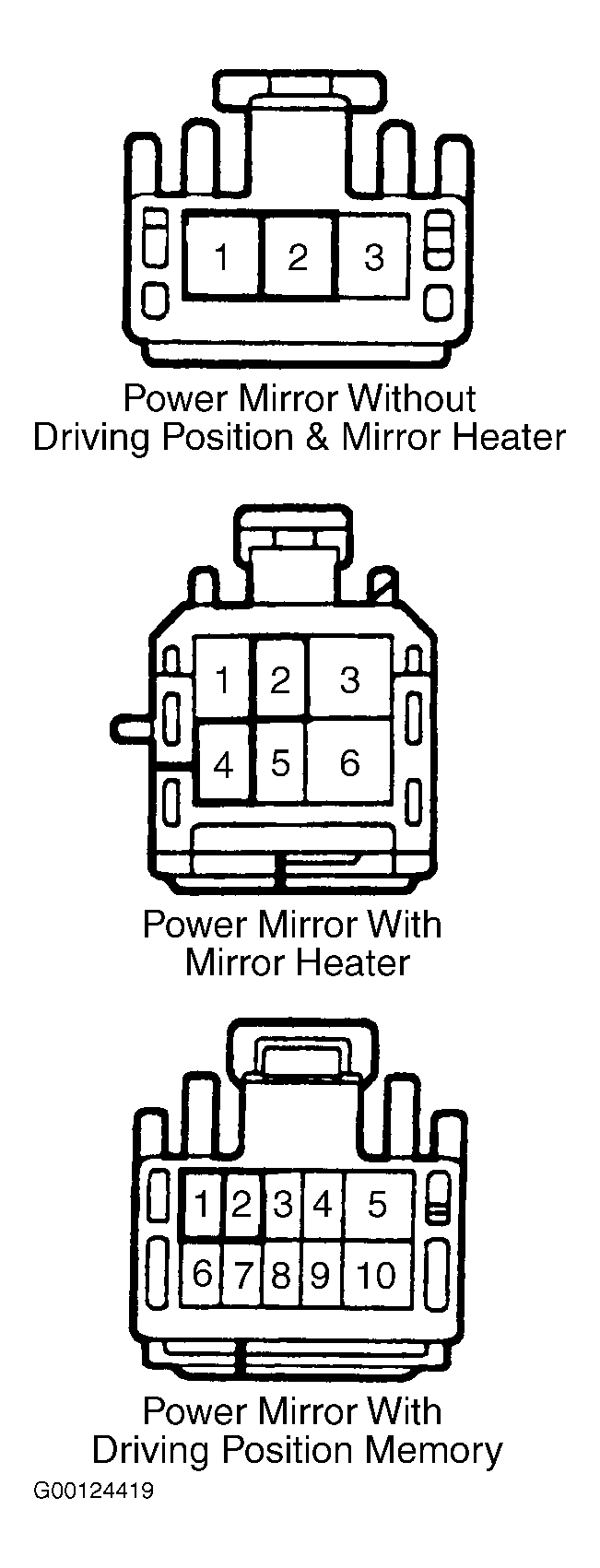 - Turn ignition off. Disconnect power mirror motor 10-pin electrical harness connector. Using jumper wires, connect positive battery voltage to power mirror terminal No. 1 and connect negative battery voltage to power mirror terminal No. 2. See Figure. Mirror should turn to the left. Reverse polarity of jumper wires and check that mirror turns to the right.