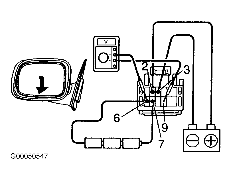 2. Using jumper wires, connect positive lead of dry cell batteries to mirror terminal No. 7 and negative lead of dry cell batteries to mirror terminal No. 6. Connect DVOM positive lead to mirror terminal No. 9 and negative lead to mirror terminal No. 6. See Fig 1.
