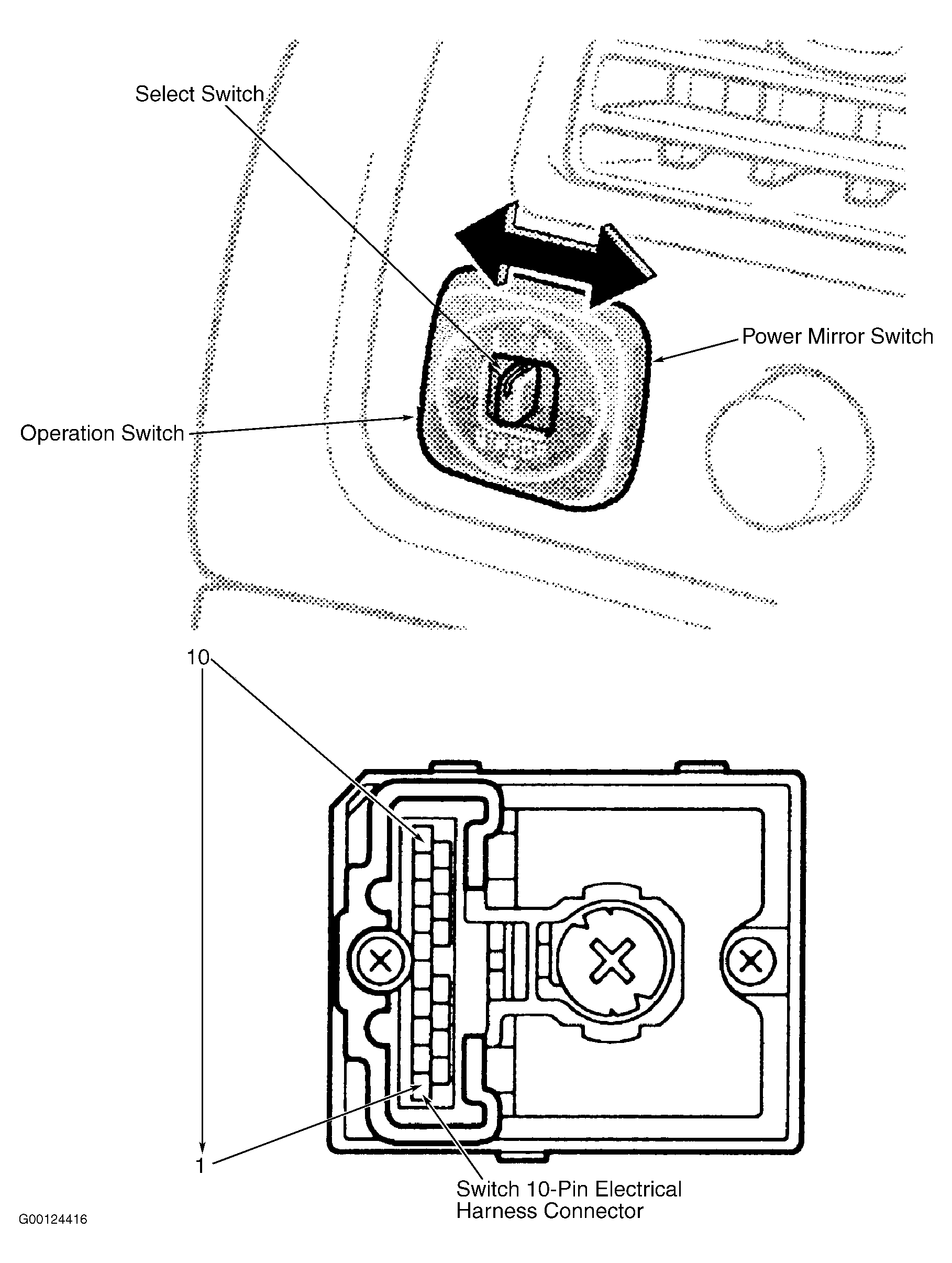 Turn ignition off. Disconnect Black 10-pin power mirror switch electrical harness connector and remove power mirror switch. Using an ohmmeter, check continuity between appropriate mirror switch terminals. See Fig 1. See appropriate POWER MIRROR SWITCH CONTINUITY TEST table. If continuity or resistance is not as specified, replace power mirror switch. If continuity or resistance is as specified, inspect switch circuit for defects or damage. See MEMORY SYSTEMS and POWER MIRRORS in SYSTEM WIRING DIAGRAMS article.
