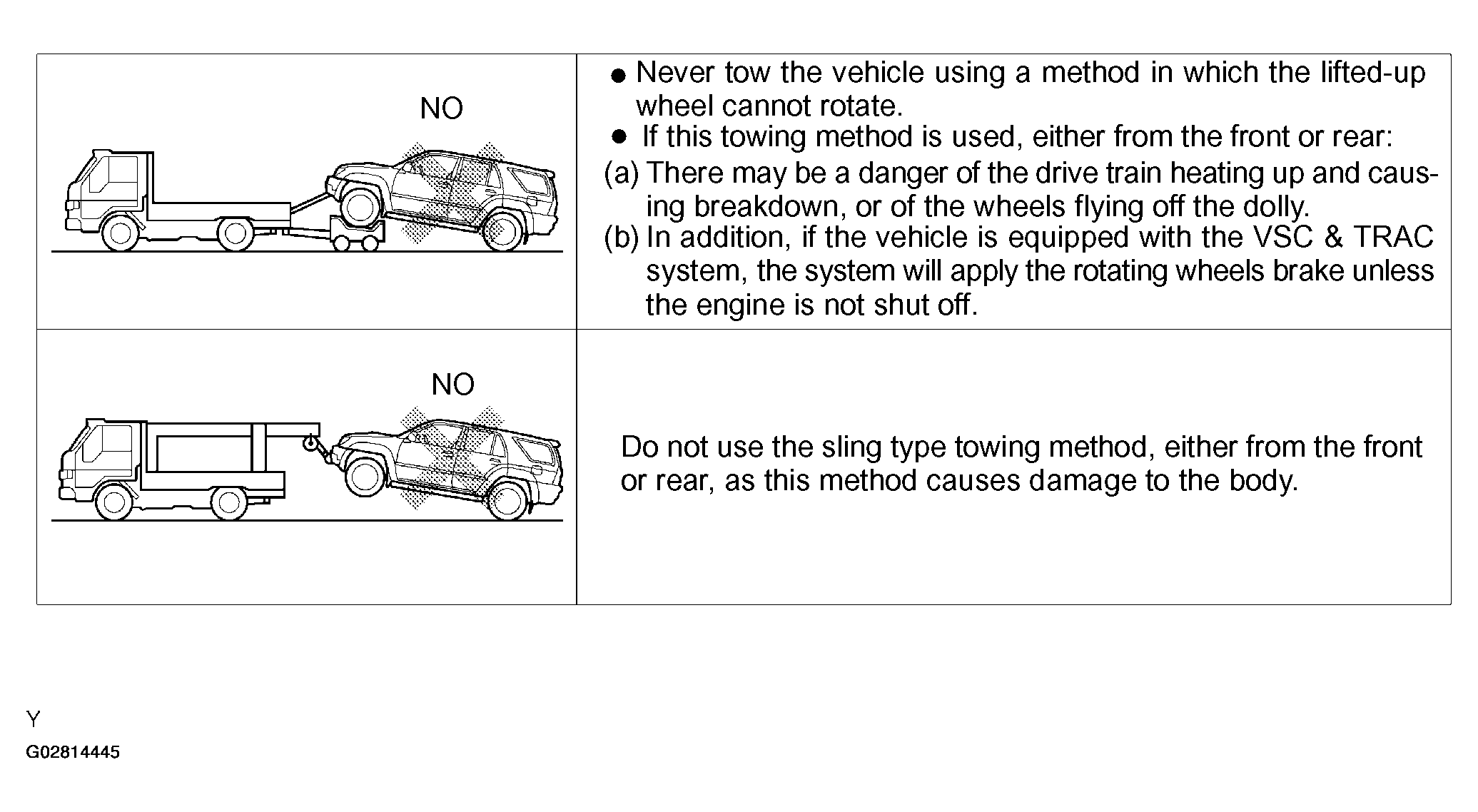 NOTE: Do not use any towing method other than those shown in Fig 39.- For example, the towing methods shown in Fig 40 are dangerous or damage the vehicle, so do not use them.