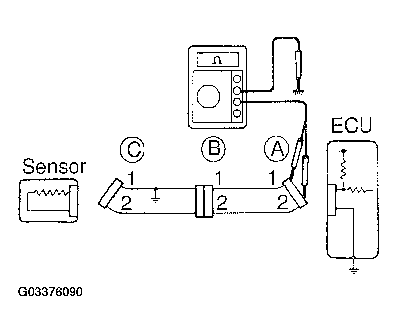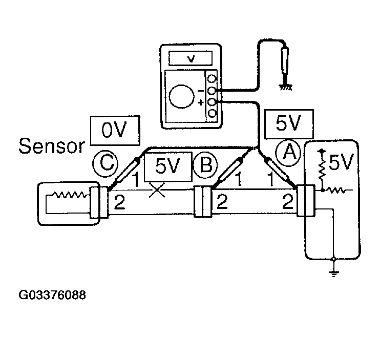 As shown in Fig 12, with each connector still connected, measure the voltage between body ground and terminal 1 of connector "A" at the ECU 5V output terminal, terminal 1 of connector "B", and terminal 1 of connector "C", in that order.
