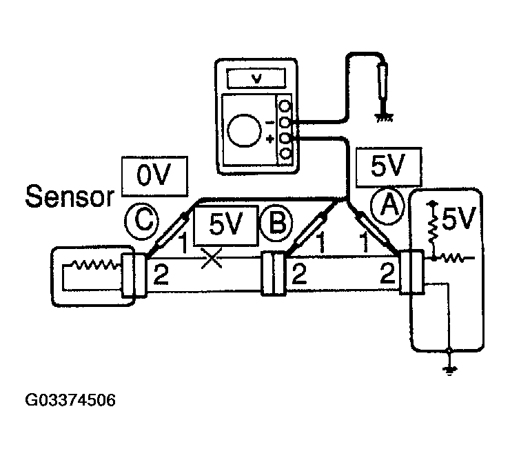 As shown in Fig 12, with each connector still connected, measure the voltage between body ground and terminal 1 of connector "A" at the ECU 5V output terminal, terminal 1 of connector "B", and terminal 1 of connector "C", in that order.
