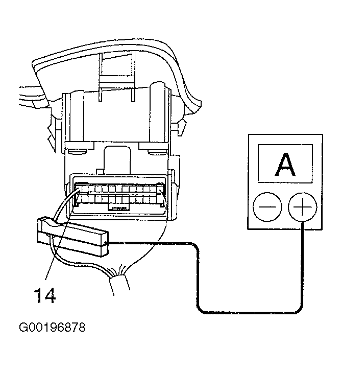 - Attach a current-measuring probe to terminal No. 14 of the wiring harness. See Fig 1.