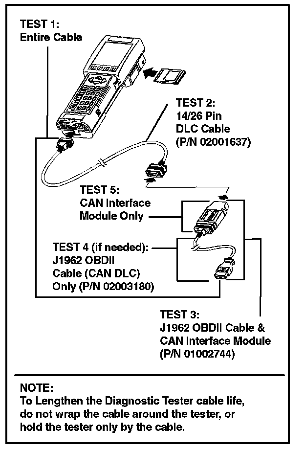 The Diagnostic Tester may operate properly in other modes such as OBD, OBDII, or CARB, with a damaged cable.