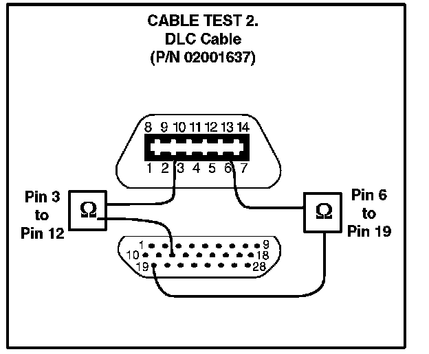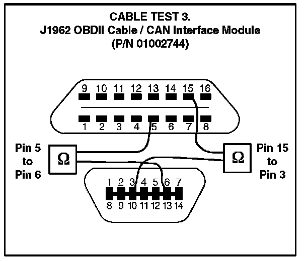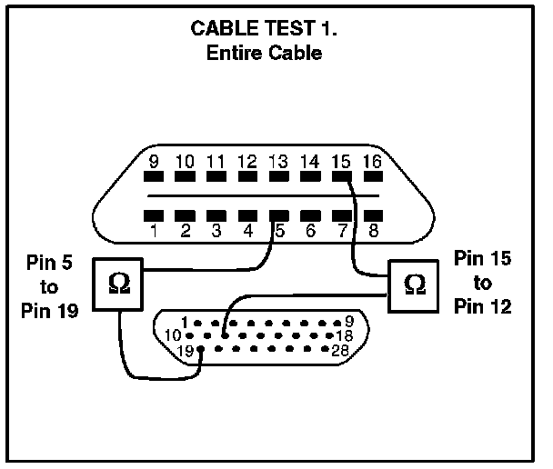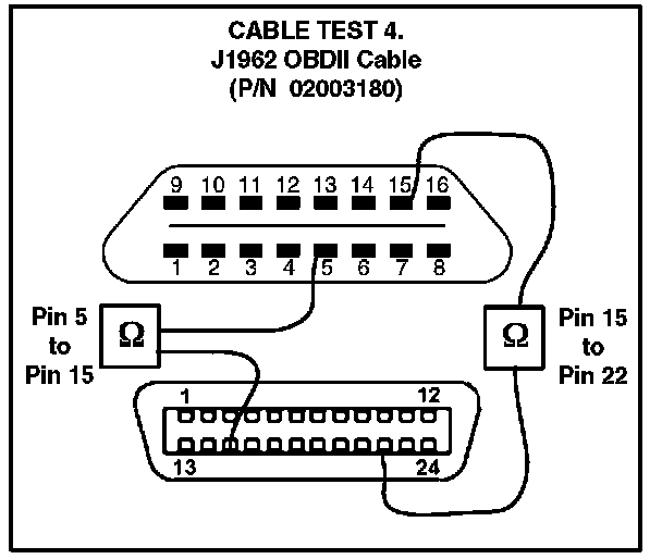 To determine if the Diagnostic Tester cable is damaged, follow the test procedures below to check the electrical integrity of the cable. Conduct all continuity tests with an Ohm meter. For all five continuity test procedures, the resistance values must be below 6.0 ohms to pass.