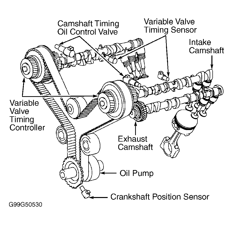 The VVT system controls intake camshaft valve timing to provide improved torque, improved fuel economy and reduce exhaust emissions. VVT system consists of 2 oil control valves, 2 VVT controllers, crankshaft position sensor, 2 VVT sensors, oil pump and Engine Control Module (ECM). See Fig 1.
