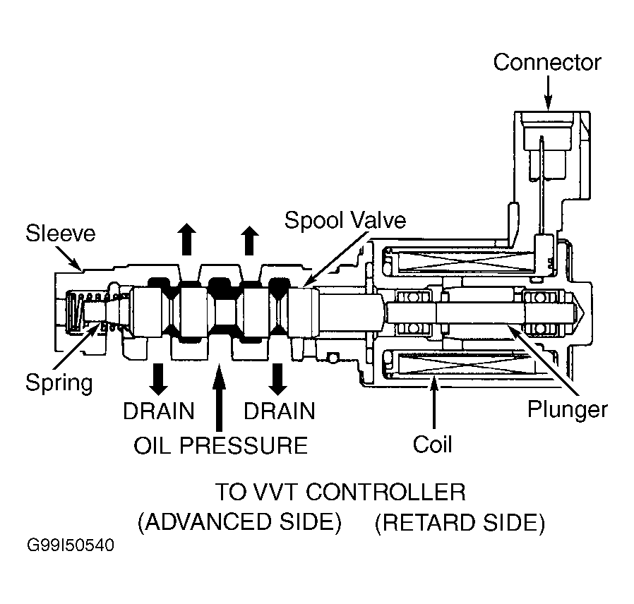 Piston movement is determined by oil control valve. Oil control valve is an electrically controlled valve that receives oil pressure from oil pump. See Figure. ECM uses input signals for engine speed, intake air volume, throttle position and engine coolant temperature to determine operation of oil control valve. ECM also uses input signals from VVT sensors and crankshaft position sensor for determining actual intake camshaft valve timing. ECM operates oil control valve by controlling position of spool valve in oil control valve. Positioning of spool valve determines which side of piston oil pressure will be applied on. By applying oil pressure on piston, piston will move inward or outward, causing intake camshaft valve timing to change.
