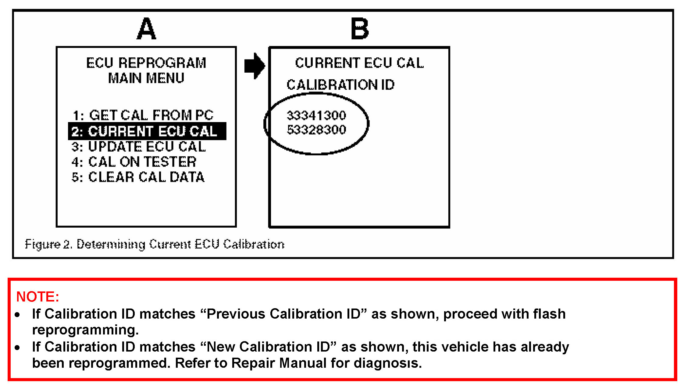 2. Connect the Diagnostic Tester to the vehicle and select CURRENT ECU CAL from the ECU REPROGRAM MAIN MENU. Determine the vehicle's current ECU calibration (see Figure 2).