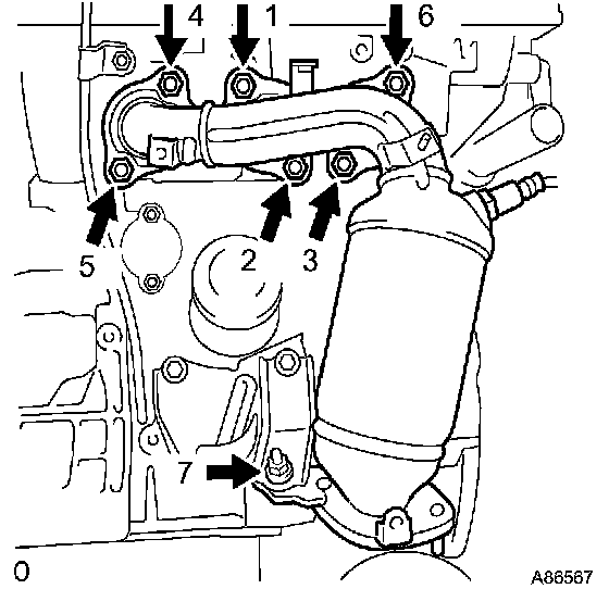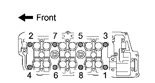 Using several steps, loosen the 8 cylinder head bolts uniformly in the sequence shown in the illustration. Remove the 8 cylinder head bolts and plate washers