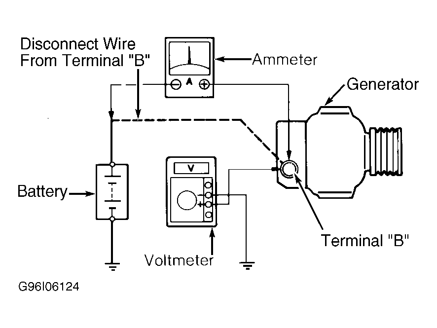 - Disconnect battery-to-generator terminal "B" wire. See Fig 1. Using an ammeter and voltmeter, connect negative ammeter lead to disconnected generator terminal "B" wire end, and connect positive ammeter lead to generator terminal "B".