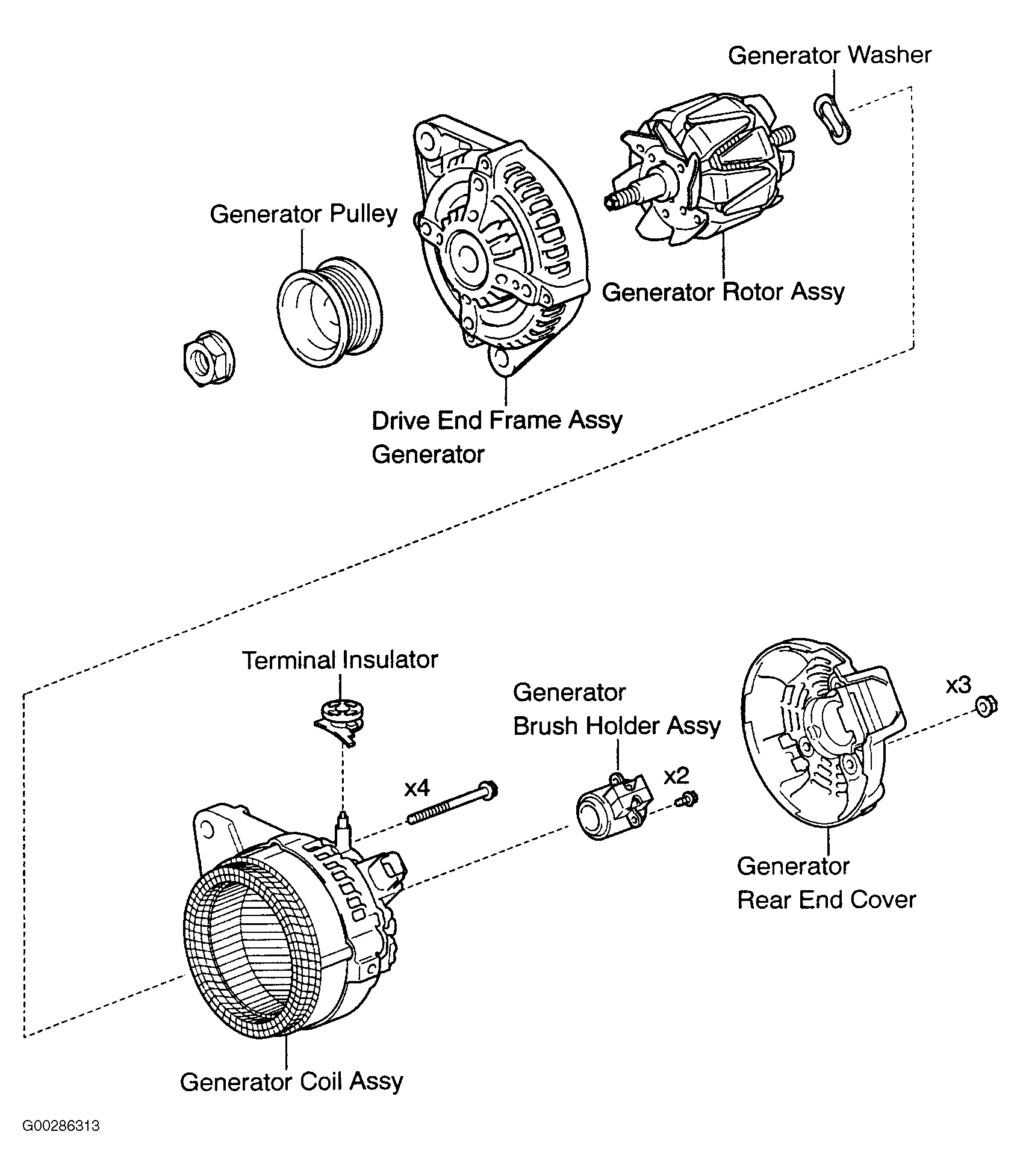 - Remove rear end cover. See Fig 1. Remove brush holder. Remove rotor from generator coil using Puller (SST 09286-46011). Remove generator washer from rotor.