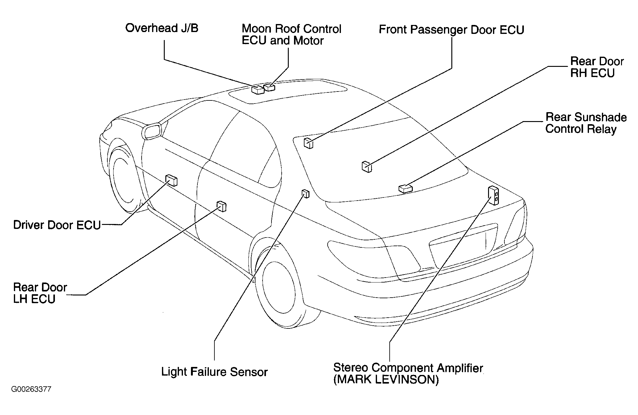 | Stereo Component Amplifier (Mark Levinson) | On right side of luggage compartment. See Figure. |