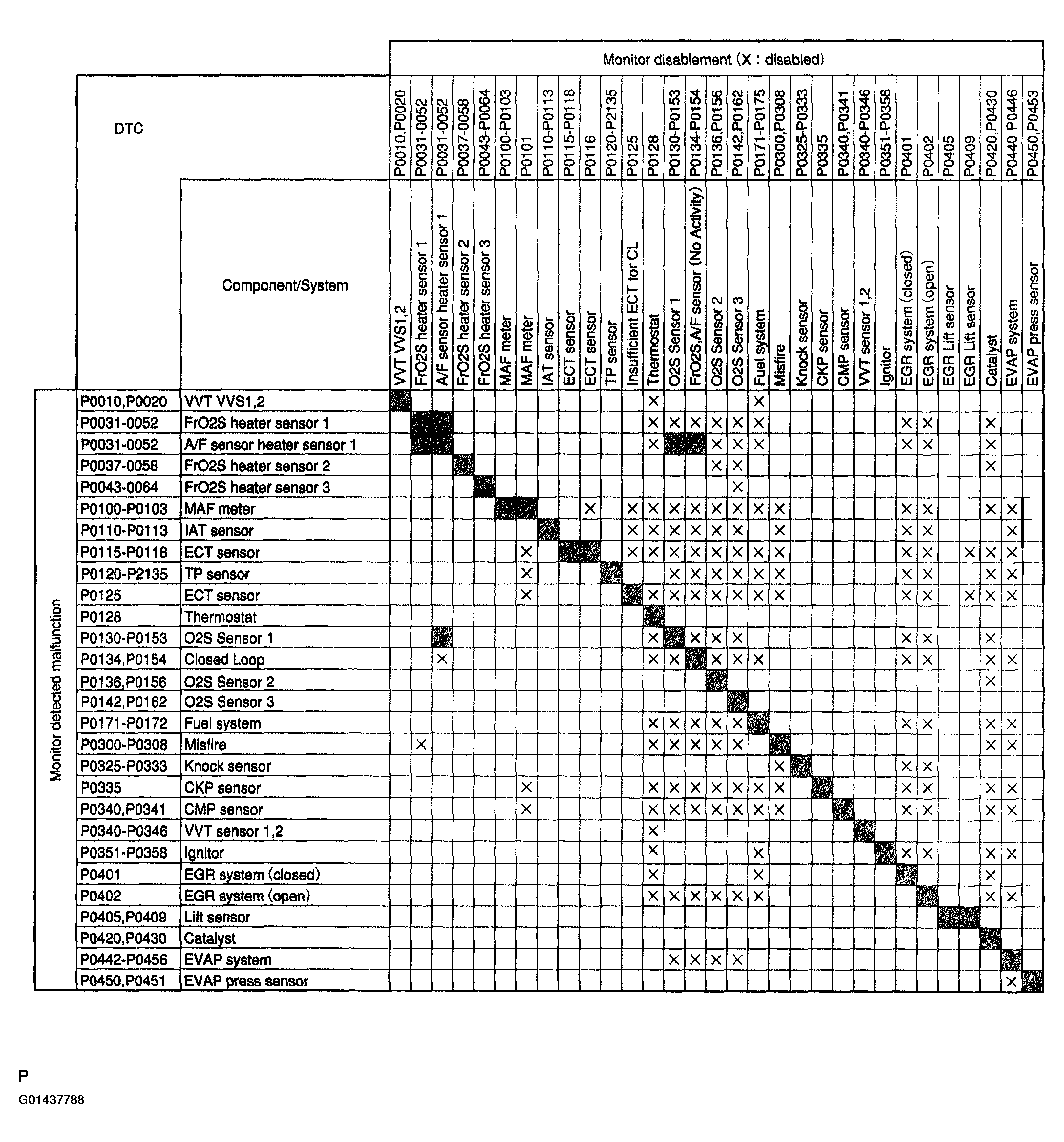 HINT: The figure Fig 1 below shows the ECM monitoring status for the components listed in the top of the table when the DTCs on the left of the table are set.