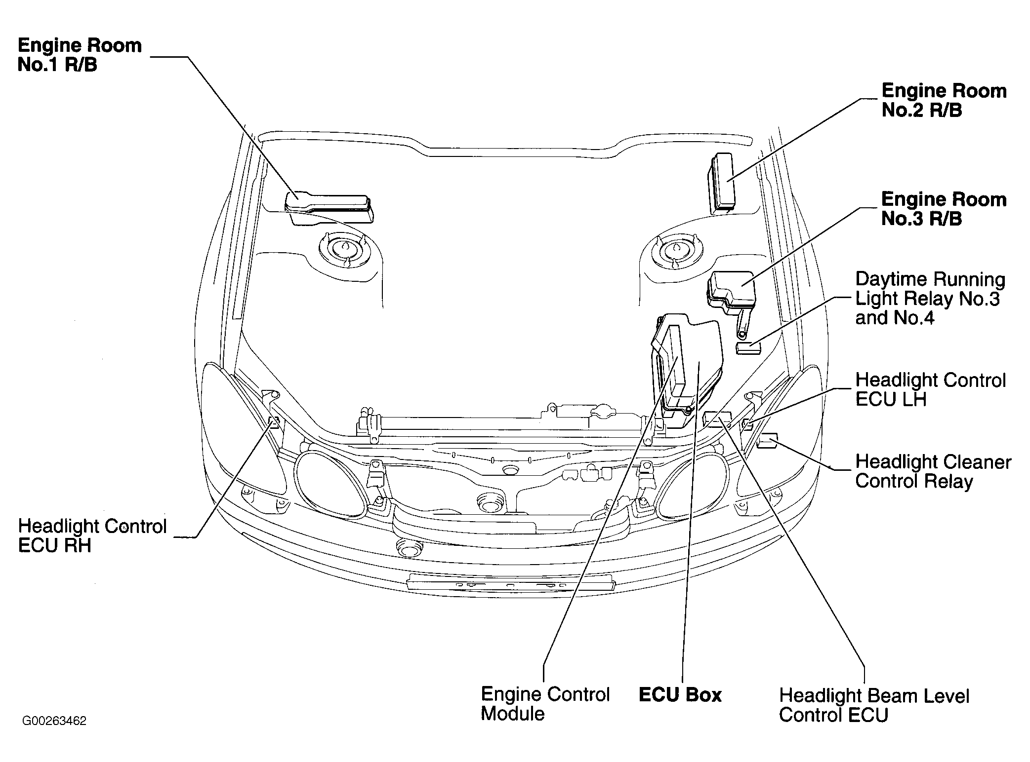 | Headlight Beam Level Control ECU | At left front corner of engine compartment. See Figure. |