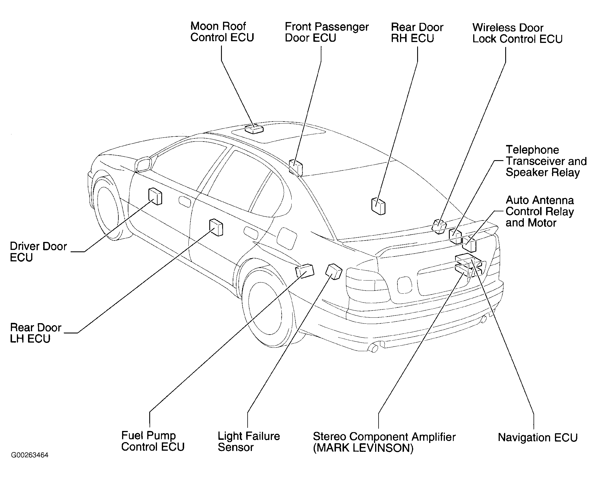 | Navigation ECU | At right rear corner of luggage compartment. See Figure. |