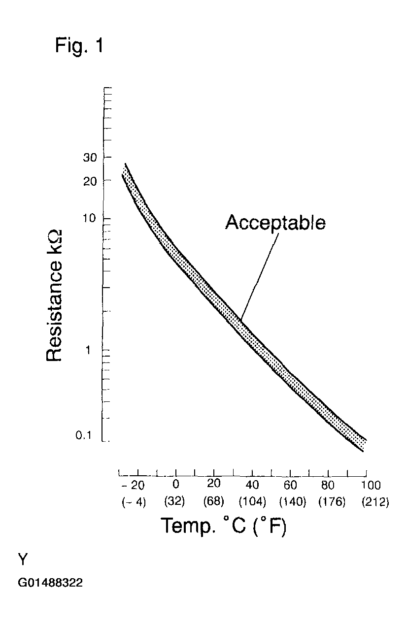 The intake air temperature (IAT) sensor, mounted on the mass air flow (MAF) meter, monitors the intake air temperature. The IAT sensor has a thermistor that varies its resistance depending on the temperature of the intake air. When the air temperature is low, the resistance in the thermistor increases. When the temperature is high, the resistance drops. The resistance varies as voltage changes to the ECM terminal. (See Fig 1).