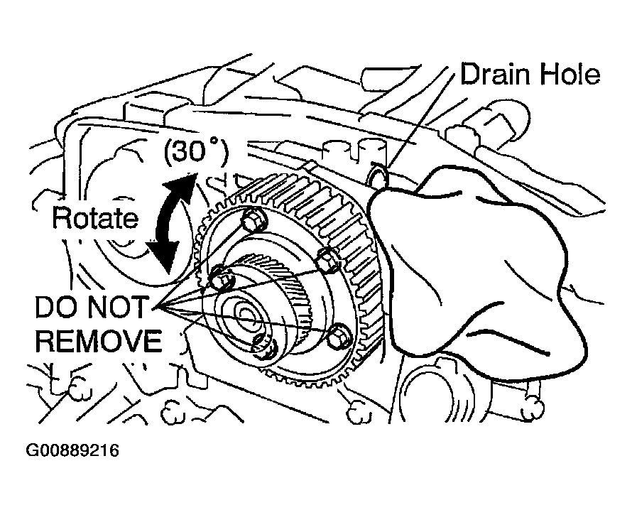 - Rotate the VVT-i pulley from left to right 2 to 3 times within its range of movement (30°) and use a waste cloth to collect the oil from the camshaft timing oil control valve installation hole.NOTE: Approximately 20 cc (1.2 cu in.) of oil will be ejected, so take care not to spill it.