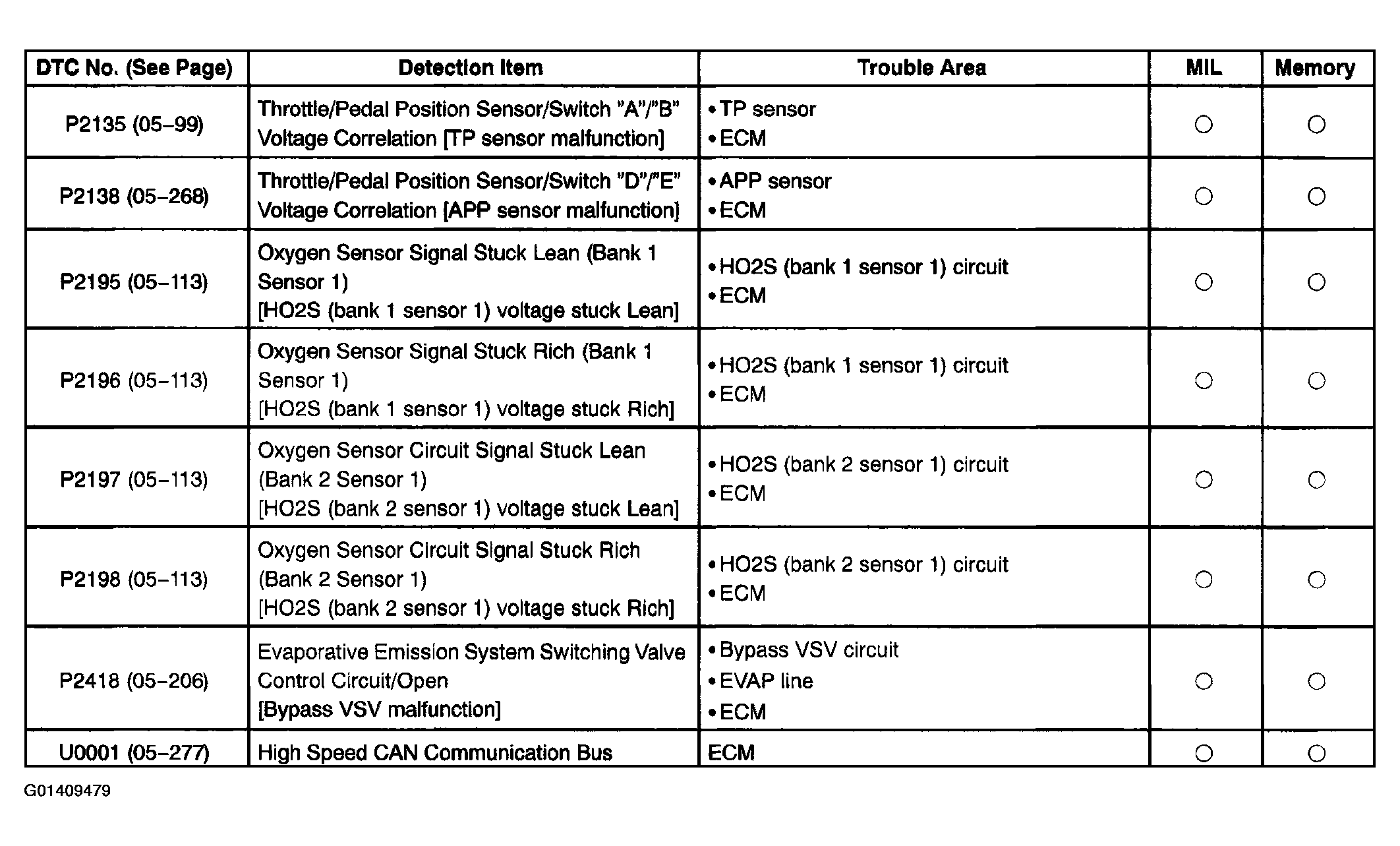 | DTC P0130, 0150, 2195, 2196 | OXYGEN SENSOR CIRCUIT (BANK 1 SENSOR 1) |