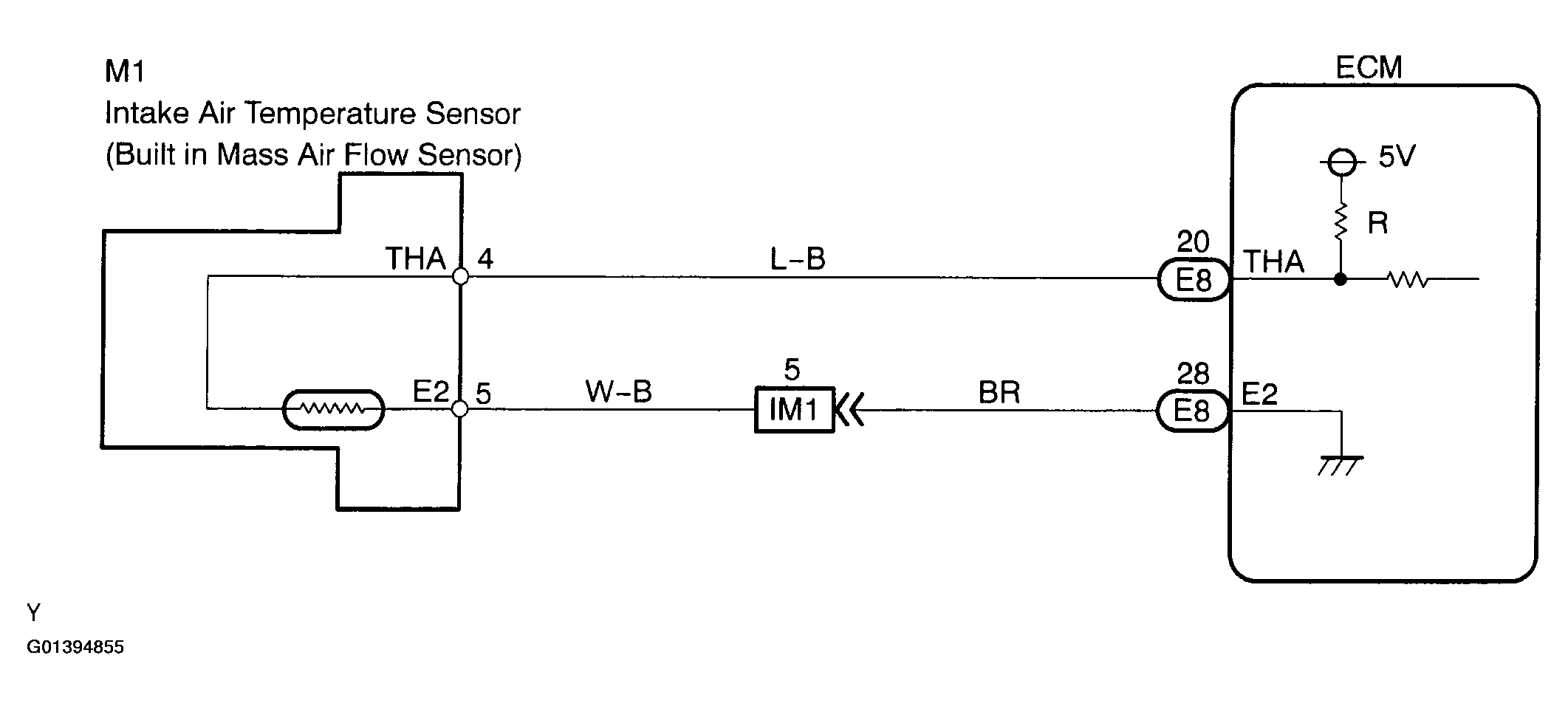 The intake air temperature sensor is connected to the ECM (See Figure). The 5 V power source voltage in the ECM is applied to the intake air temperature sensor from terminal THA (THAR) via resistor R.
