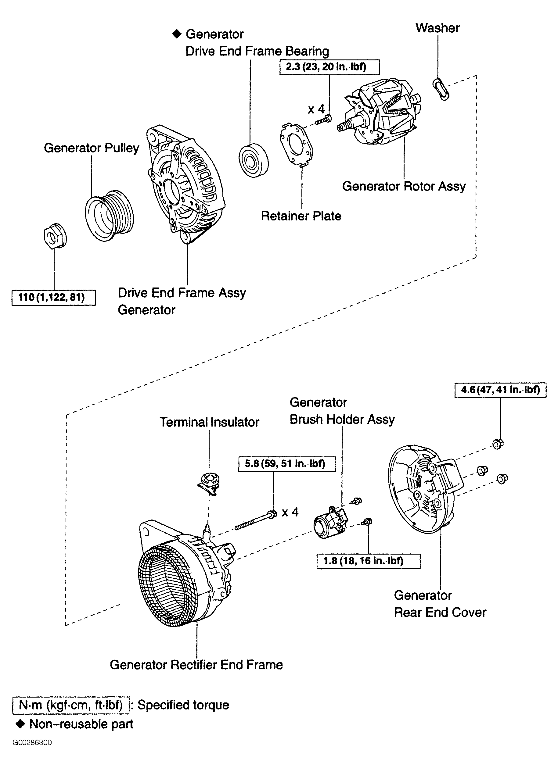- Remove rear end cover. See Fig 1. Remove terminal insulator. On 100-amp generator, remove brush holder. On 130-amp generator, remove seal plate with whole in it. Remove brush holder. Remove inner seal plate. On all generators, remove rotor from generator coil using Puller (SST 09286-46011). Remove generator washer from rotor.
